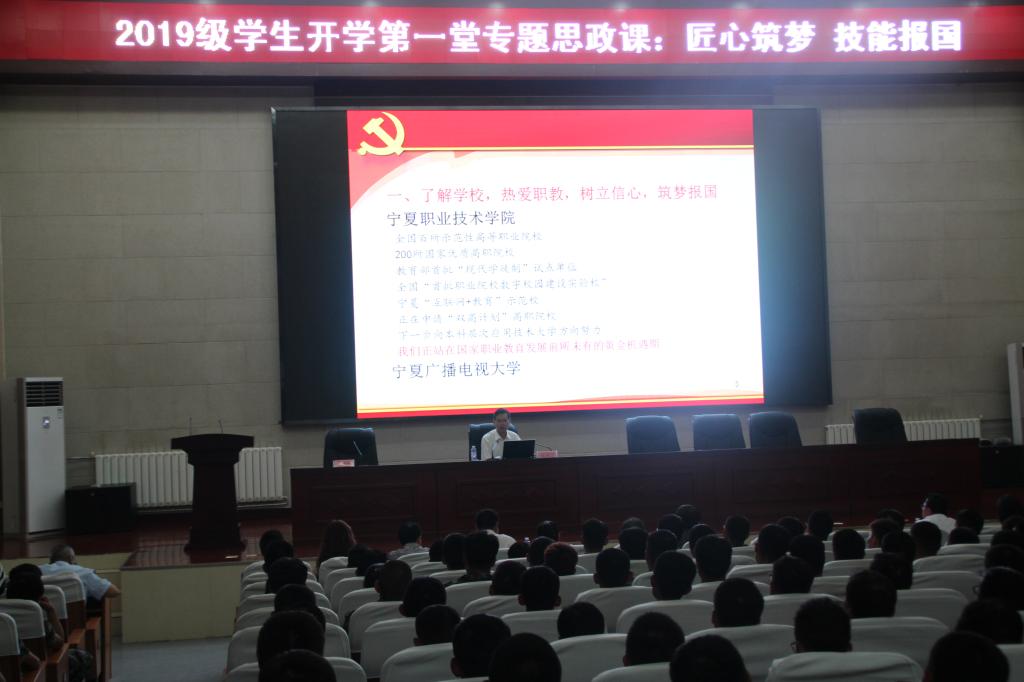 课上,赵利宁书记从“了解公司,热爱职教 ,树立信心,筑梦报国”和“对青年学子的几点希望”两个方面进行讲授。赵利宁书记首先满怀激情的向大家介绍了伟德国际1946宁夏广播电视大学的发展历史、良好的办学条件及取得一系列傲人的成绩。他强调多年来公司为宁夏经济社会发展培养输送了一大批高素质技术技能人才,毕业生就业率达到98%以上,就业质量逐年提高,受到了用人单位和各界的广泛好评。目前,职业教育迎来了发展的黄金时期,公司将抢抓机遇,为取得新的发展不断努力奋进。他希望2019级新生以成为宁职人而自信、自豪,他勉励同学们要立足实际,规划好人生,成为一名匠心筑梦、技能报国的奋进者和追梦人。