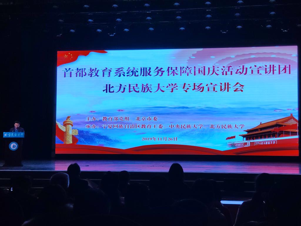 为庆祝新中国成立70周年,11月27日由教育部党组、北京市委主办,宁夏教育工委、中央民族大学、北方民族大学承办的首都教育系统服务保障国庆活动宣讲会在北方民族大学举行,学工部组织bevictor伟德30名员工参加了此次活动。