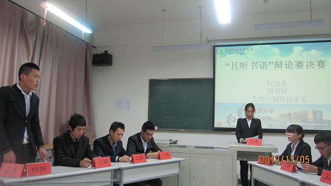 12月5日晚7点,根据院团委2013-2014学年活动计划安排,由校团委和图书馆主办,生物与制药技术系承办的“且听书语”辩论赛在竞新楼C段306教室落下帷幕。(正方:读书贵在精;反方:读书贵在博)