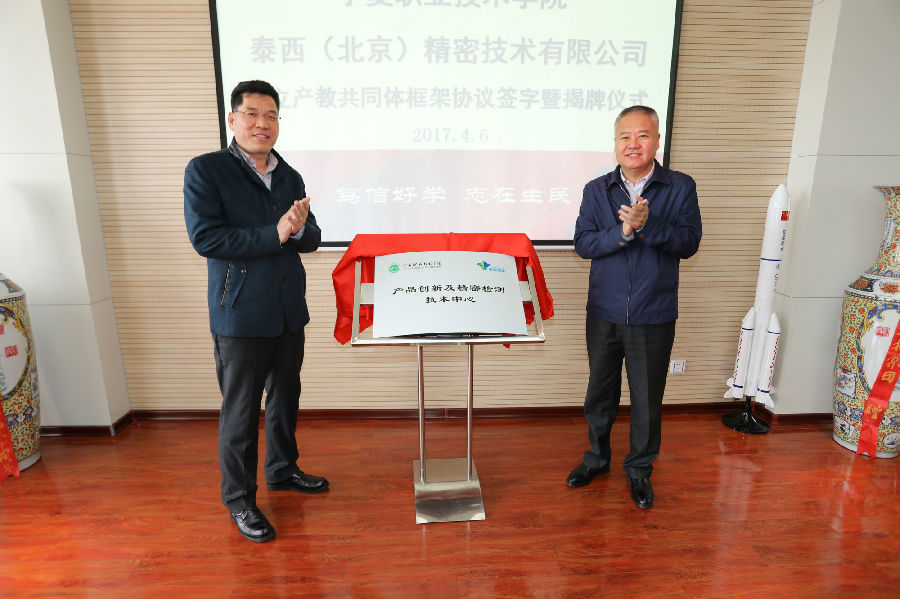会后,苏晓军副董事长与泰西(北京)精密技术有限公司共董事长路全忠签订产教共同体框架协议并为“产品创新及精密检测技术中心”揭牌。