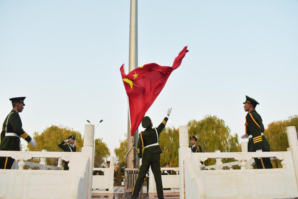 五星红旗自诞生起,久经战火饱经风霜,在枪林弹火中屹立,在乱世硝烟中前行。扬起五星红旗是同先烈们对话、是对爱国精神的传承。士官生国旗护卫队身穿制服,英姿飒爽,他们迈着铿锵有力的步伐,在全体人员的瞩目下完成了属于他们的光荣使命。伴随着国歌《义勇军进行曲》的奏起,在全体师生嘹亮的歌声中,五星红旗冉冉升起。