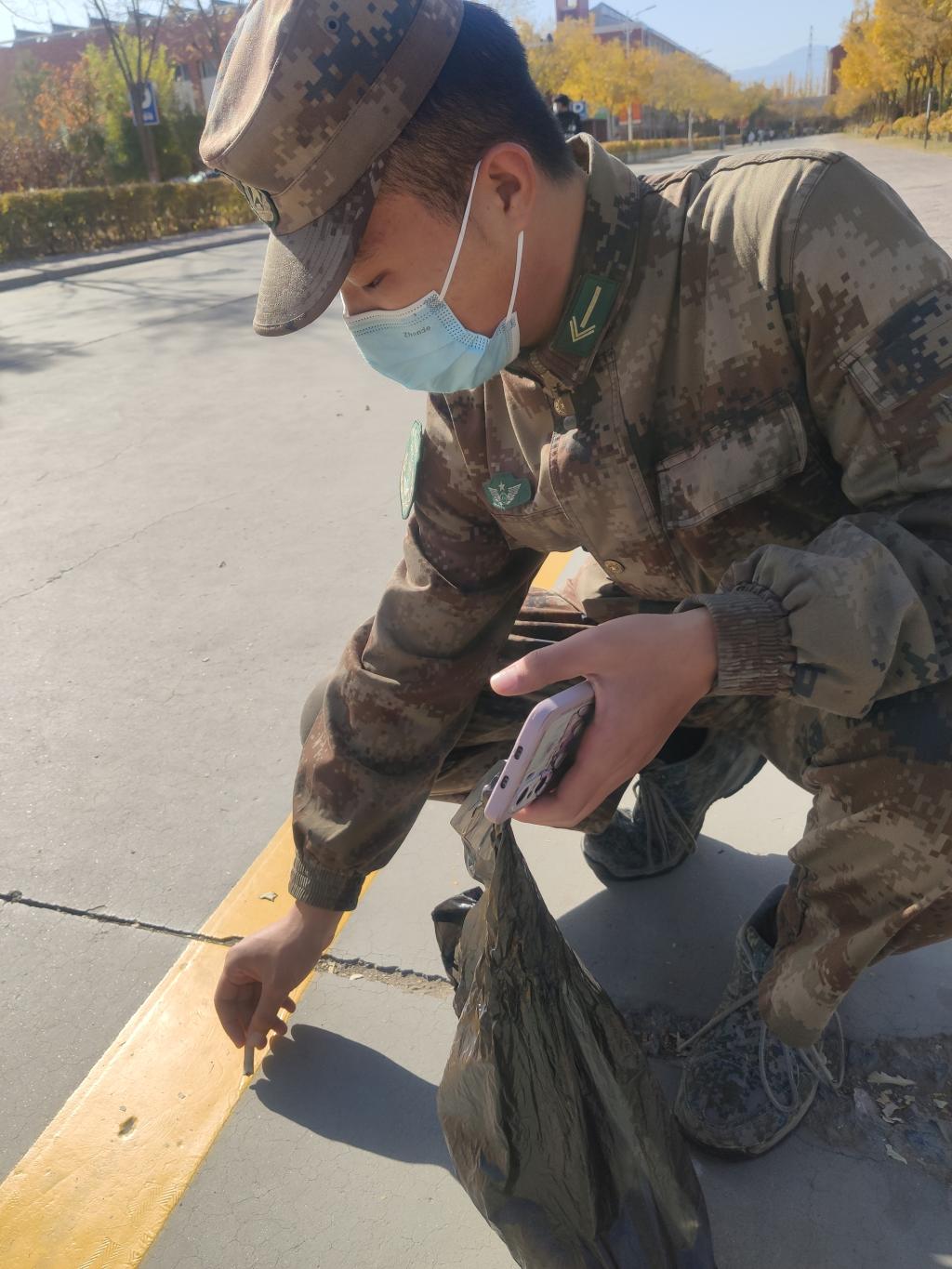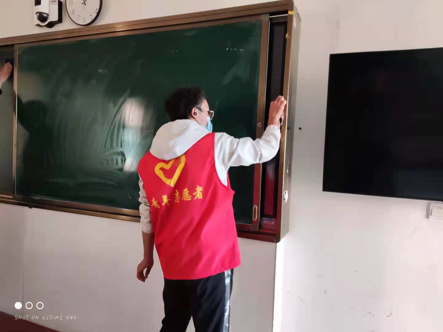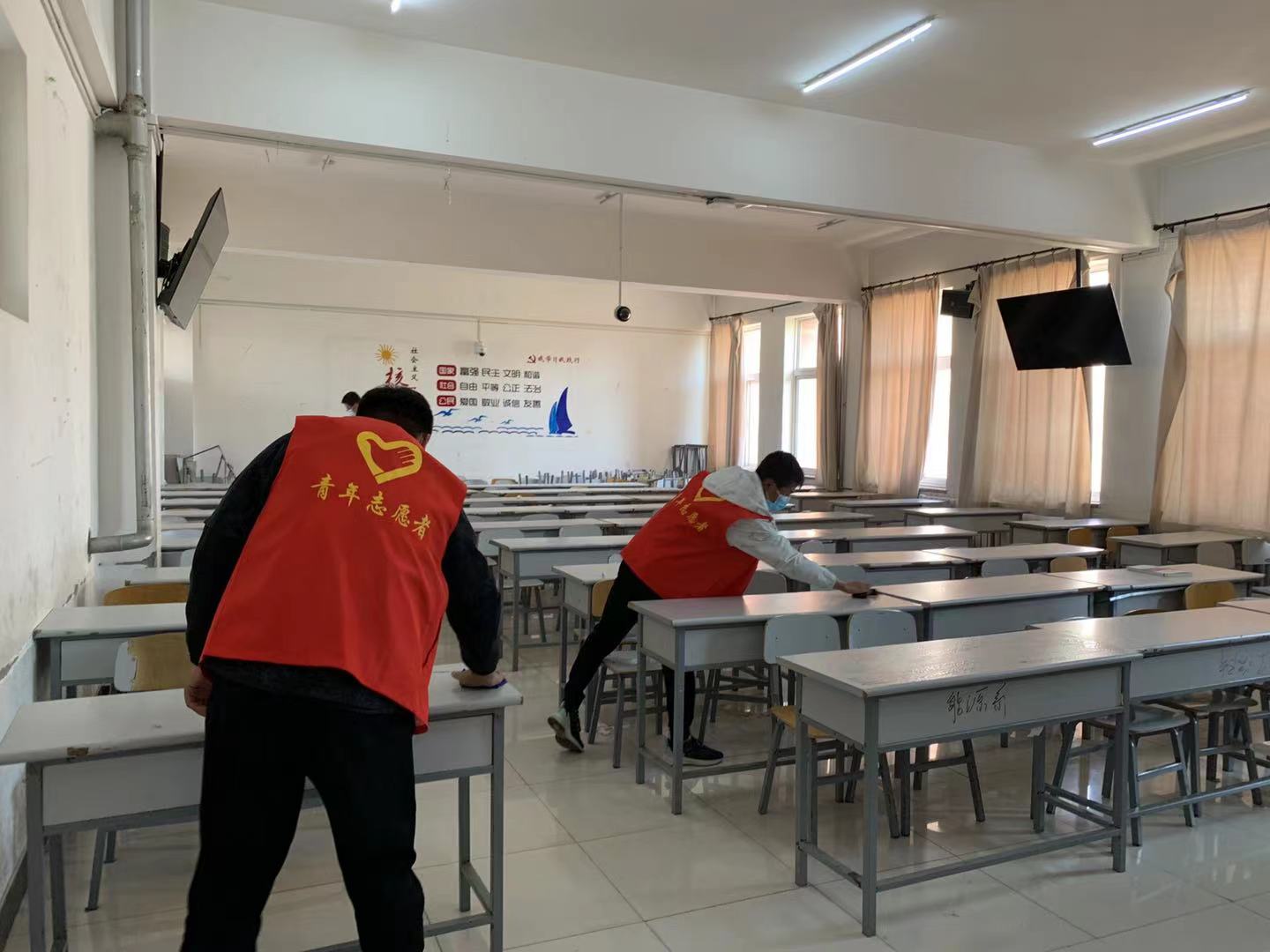 活动伊始,同学们积极要求加入到志愿服务队伍中来。工公司教室多、宿舍多,也是同学们学习、生活最重要的场所。志愿者们对教室、宿舍等区域进行了全面消杀,开窗通风,按1000ml水加一片消毒片的配比要求,喷洒地面、擦拭门把手、讲台、桌椅、窗台等地,对教学楼周围的垃圾、烟头也进行了清理。