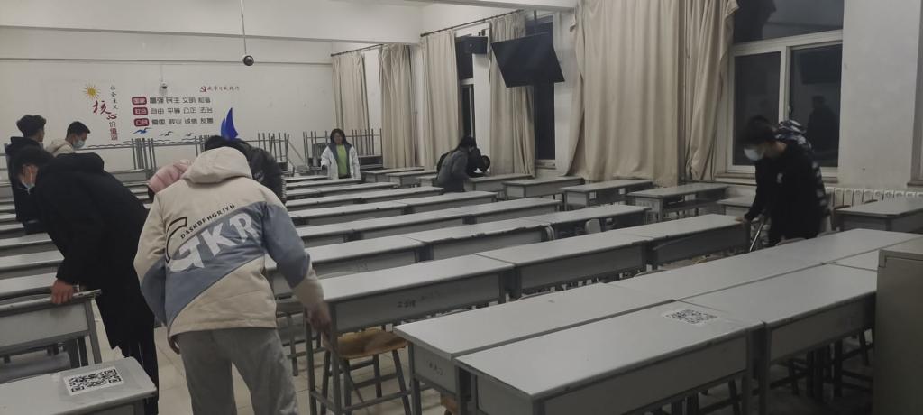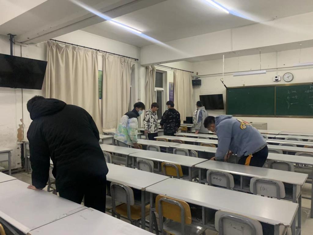 11月28日下午,公司团学干部带领30名志愿者到竞新楼323、321公共教室进行卫生清理工作并对重点区域进行消毒杀菌。
