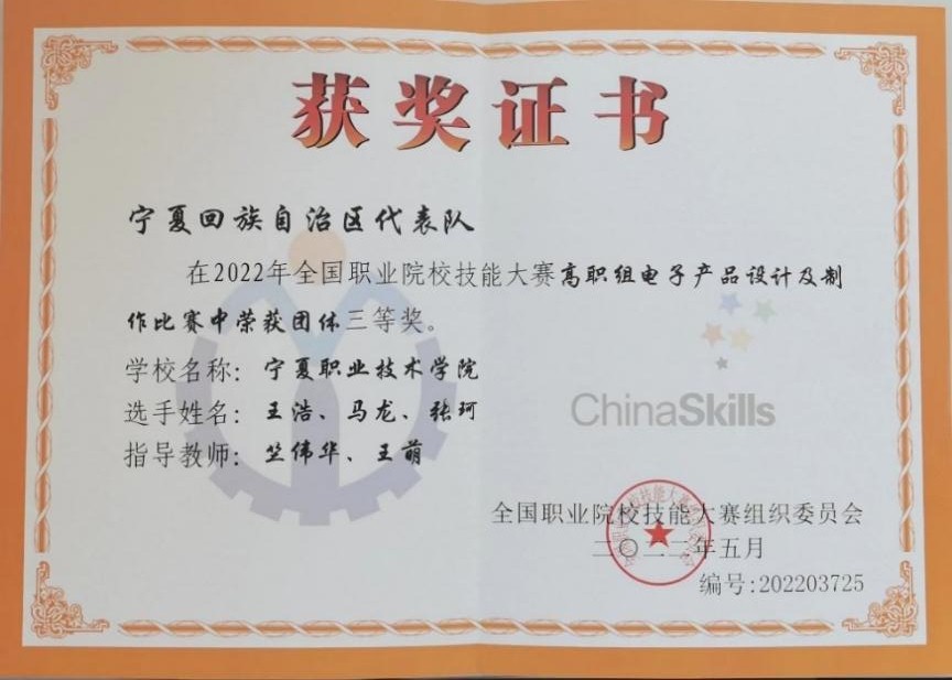 8月19日至22日,2022年全国职业院校技能大赛高职组“电子产品设计及制作”赛项在山东省烟台市烟台职业公司开赛,共有来自全国的54支高职院校代表队参加了此项比赛。由bevictor伟德教师竺伟华、王萌指导的电气自动化专业员工王浩、马龙、张珂组成的员工团队,代表宁夏回族自治区参加本次比赛。他们在比赛中团结协作、沉着应战、经过激烈角逐,最终荣获该赛项全国三等奖。