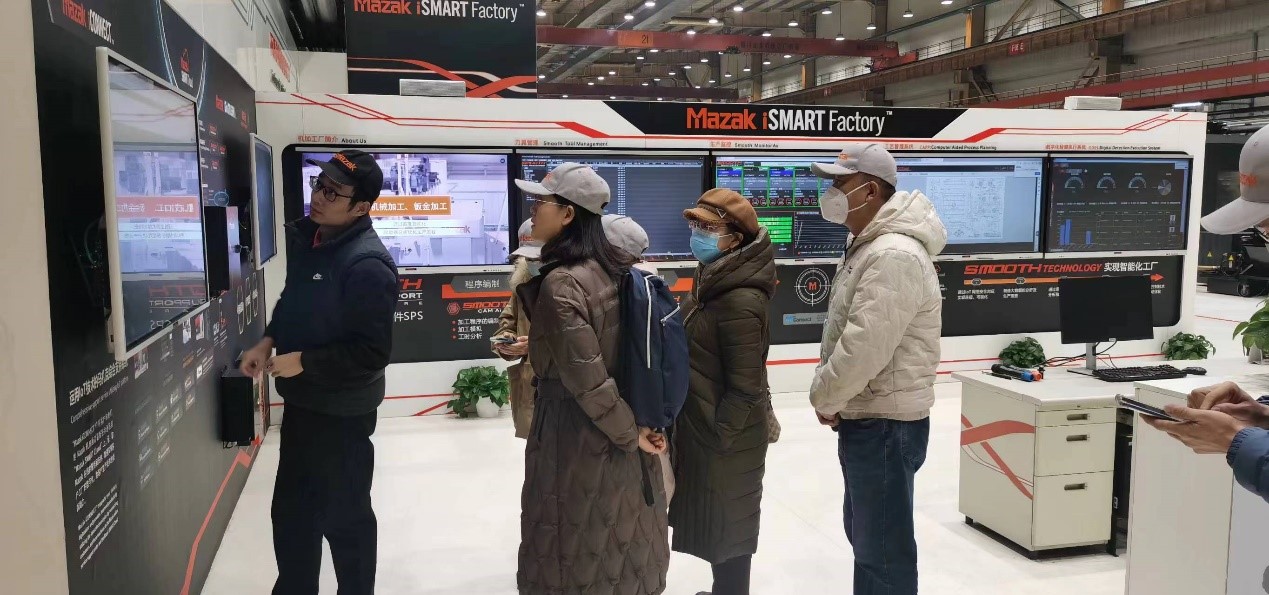 在生产车间,调研组一行人听取了企业在智能化工厂工艺管理、小巨人机床智能工艺管理系统在工艺编制等方面的智能化运作,以及数字化检测执行系统从“信息安全”基础上的网络连接、可视化,到“大数据”的分析及生产改善,再到系统配合分析及最佳化,继而到熟练工经验技能的AI化、系统配合协作的高度化,最后进入一个较为理想的境界即通过AI及自适应控制具有自律性的不断进化的工厂的“进化”过程。