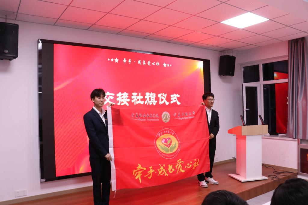 随后,新旧社团负责人交接社团旗帜,标志着第十四届牵手·成长爱心社全体成员正式上任,紧接着新任社团负责人进行了表态发言,他的话语中充满了对前任社团负责人的敬意与感谢,同时也透露出对未来工作的坚定信心,他回顾了牵手·成长爱心社过去的辉煌历程,表示能够接任这一重要职务,他感到无比的荣幸与自豪。
