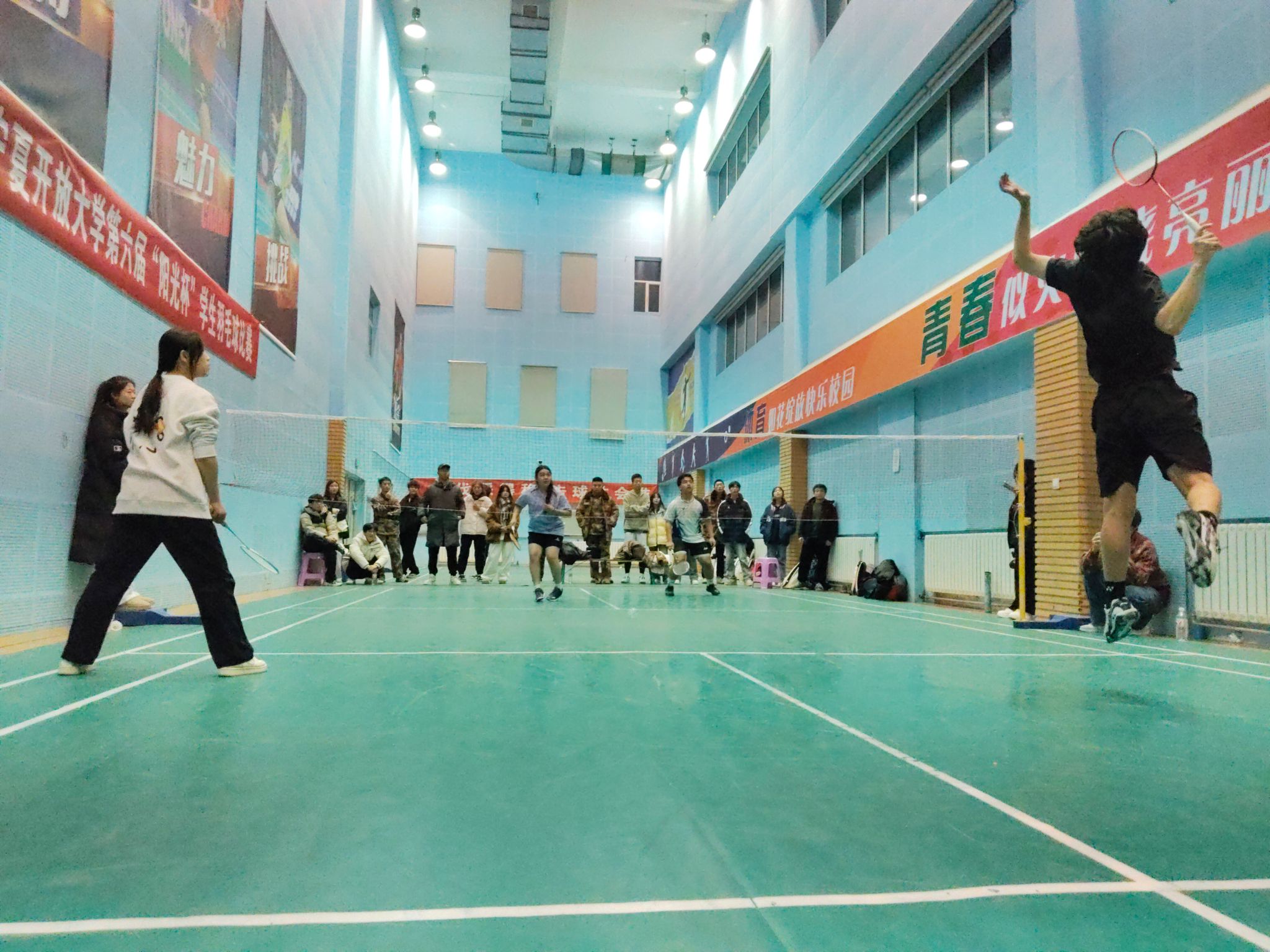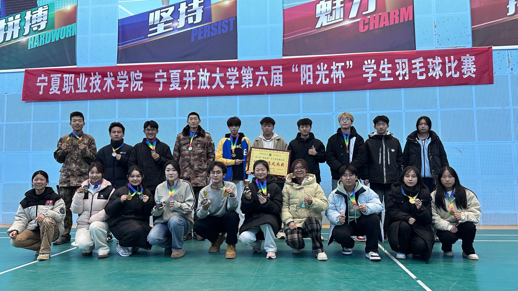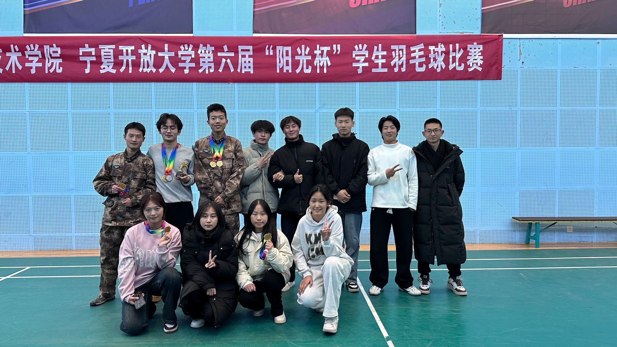 羽毛球团体赛,bevictor伟德学子顽强拼搏,积极进取,经过激烈对决,摘得冠军。