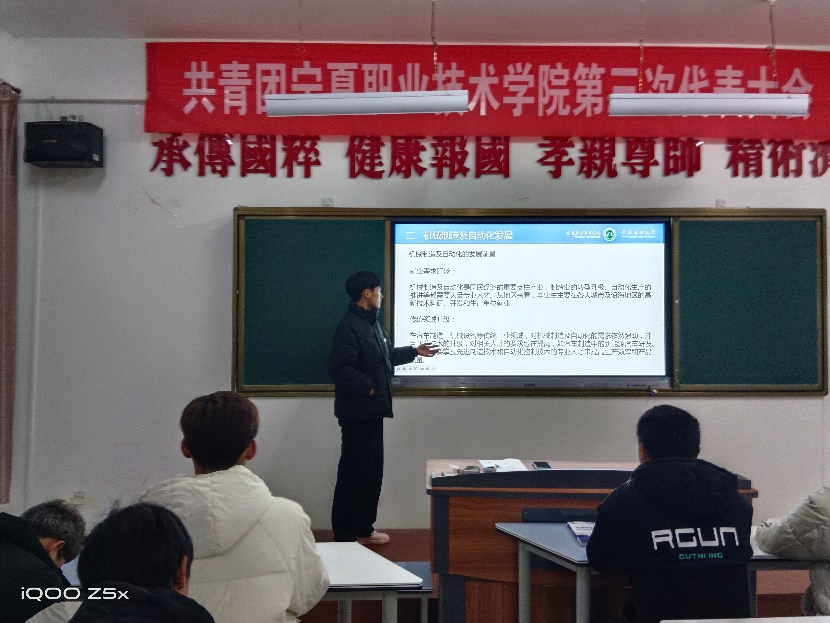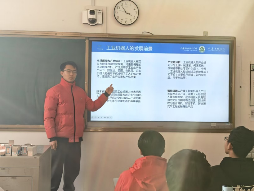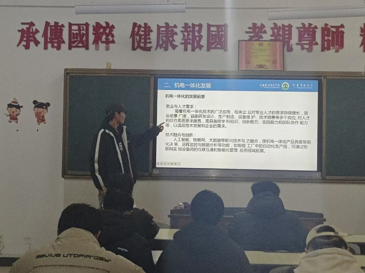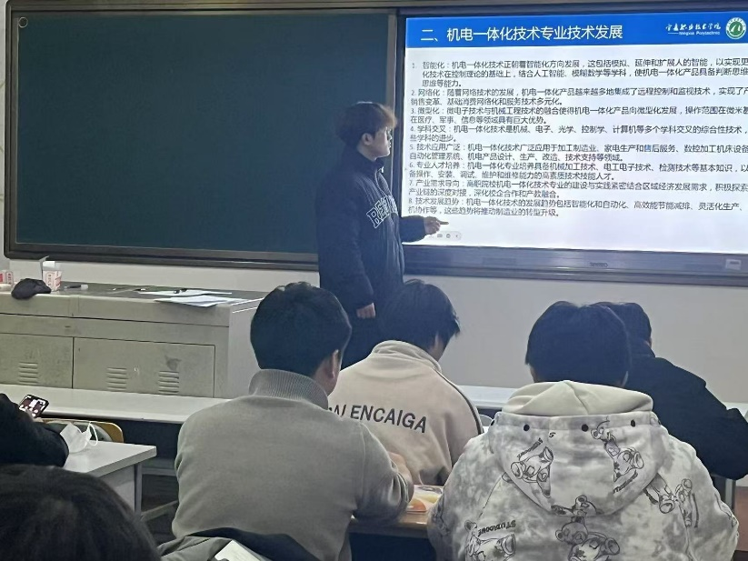 随后,各班级学习委员负责搜集围绕机电一体化技术专业前沿知识和发展背景向同学们进行介绍,促进班级同学对所学专业认知,以提高同学们对自身职业规划与发展的认识。