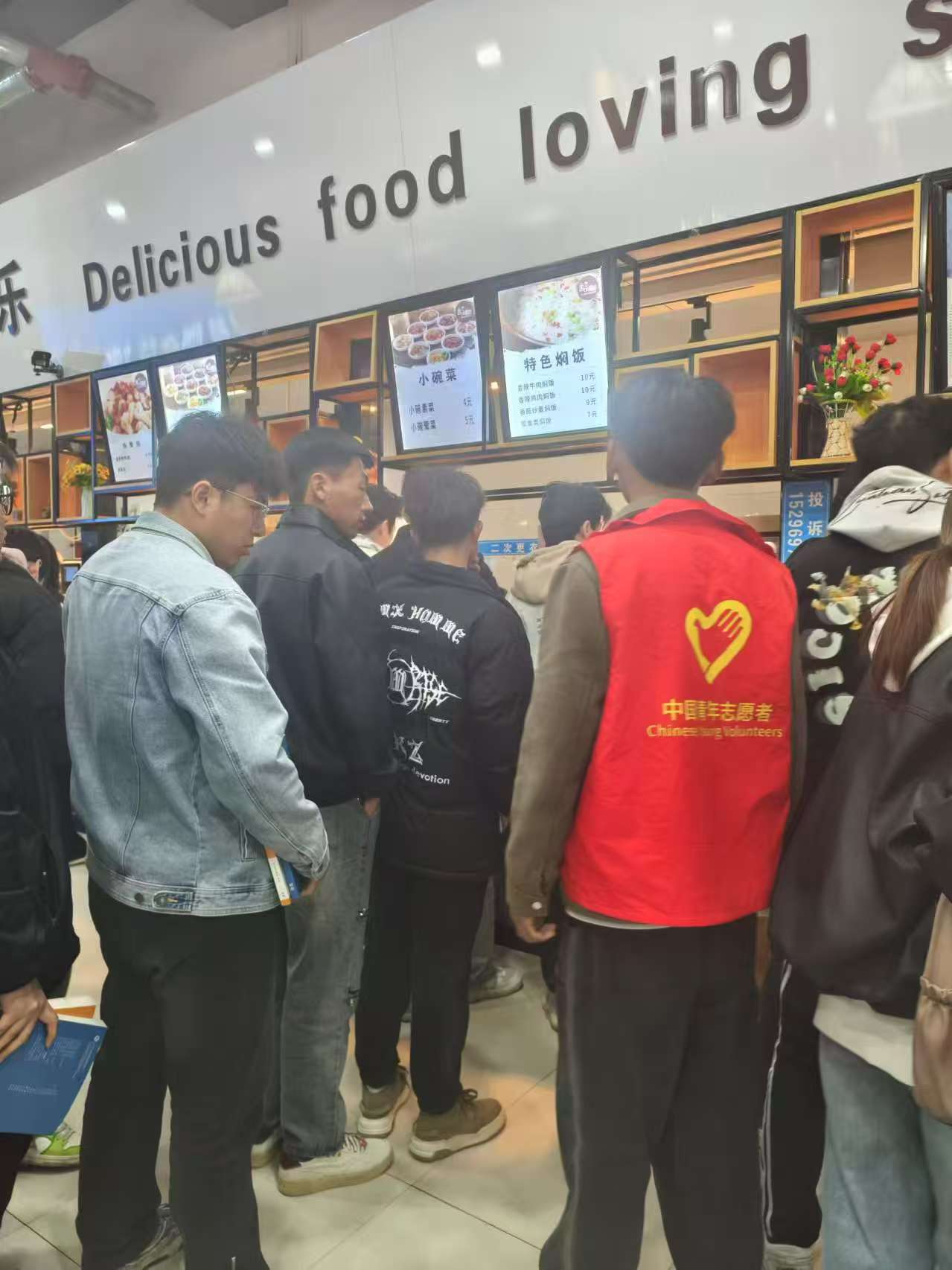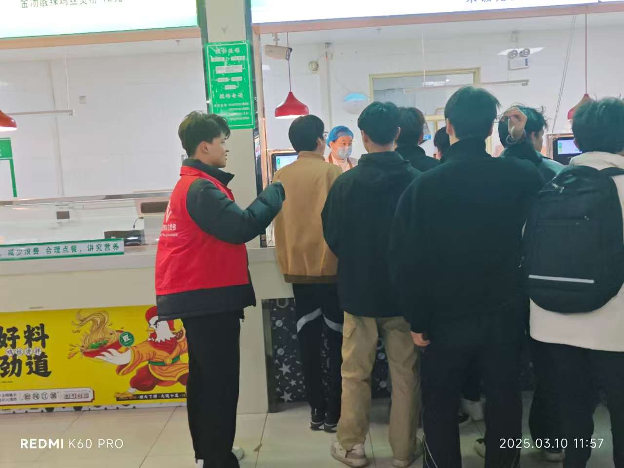 在用餐文明引导活动中,志愿者们身着统一服装,分批次在校园餐厅各楼层开展志愿服务。他们耐心引导同学们有序排队、按需取餐,倡导“光盘行动”,杜绝浪费。