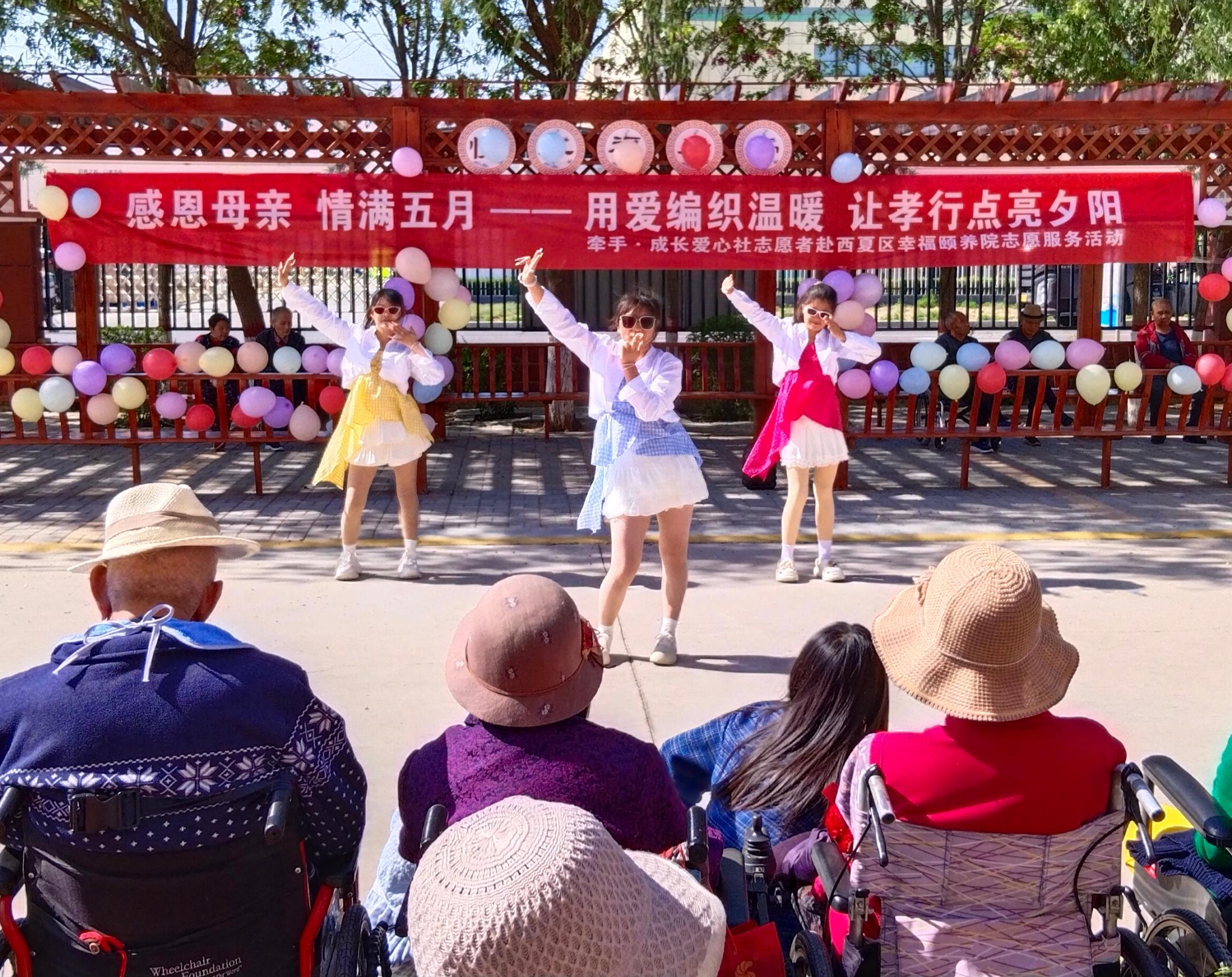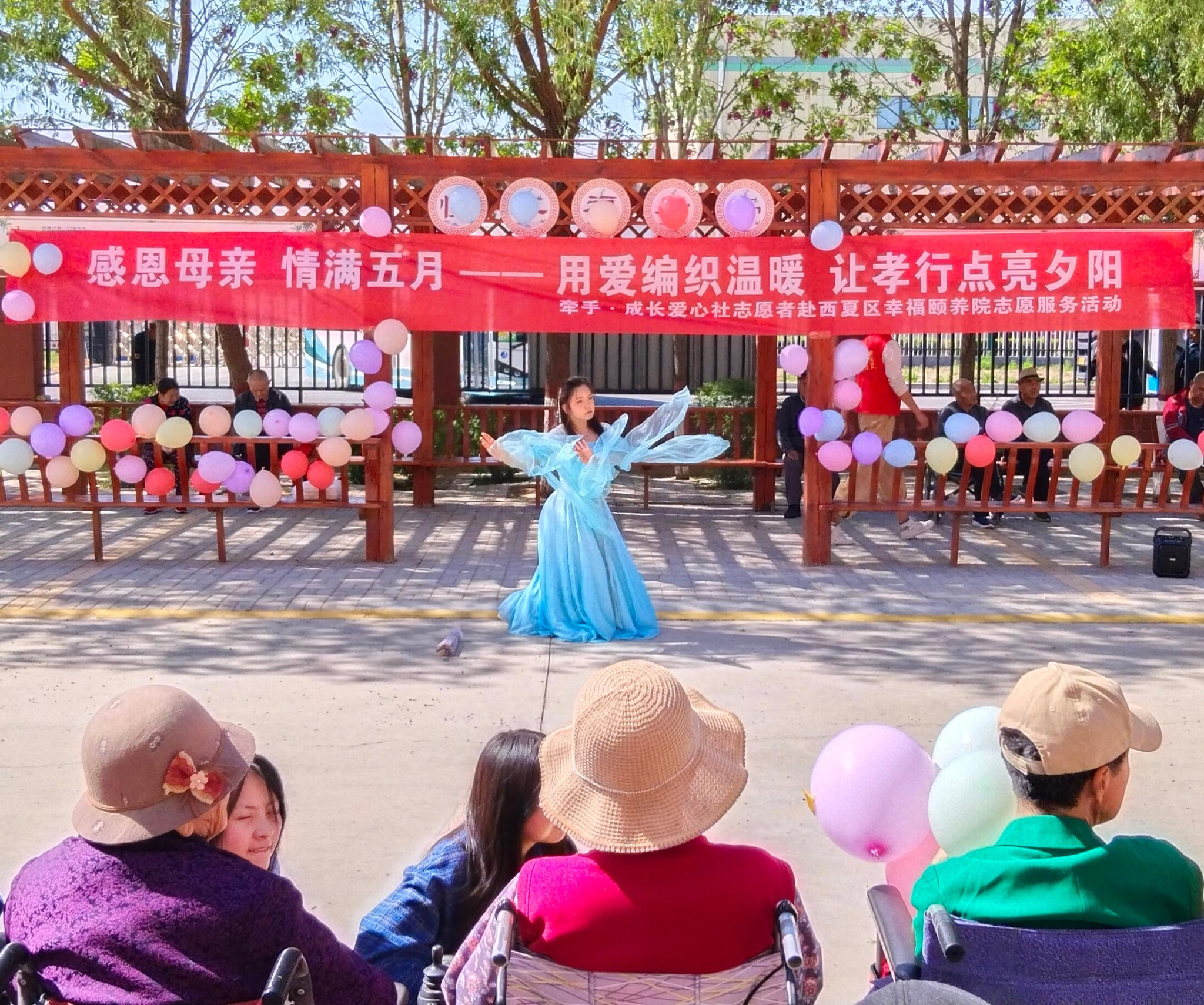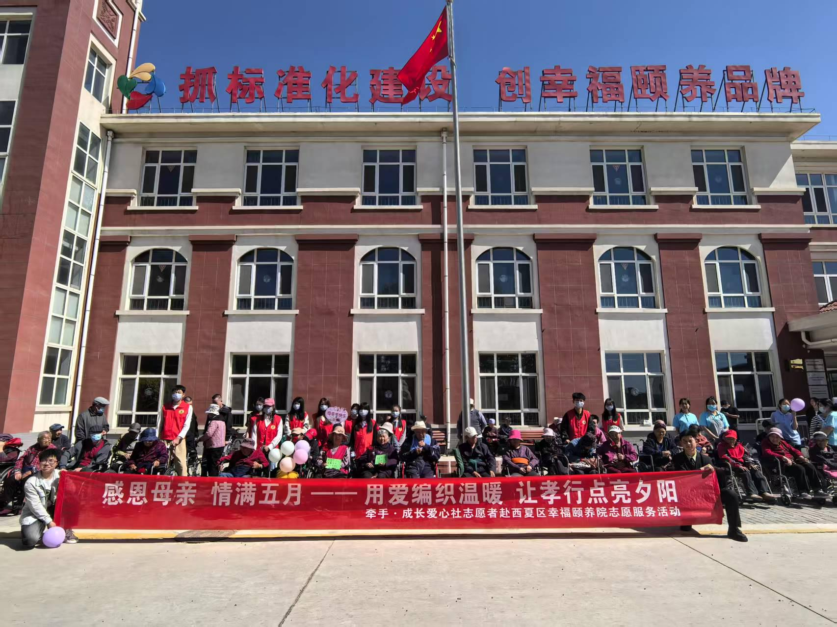 2025年5月11日,正值母亲节之际,牵手·成长爱心社联合老员工艺术团话剧部,组织40余名志愿者,赴西夏区幸福颐养院,以“感恩母亲,情满五月——用爱编织温暖,让孝行点亮夕阳”为主题,为院内老人献上了一场充满温情与活力的志愿服务活动。