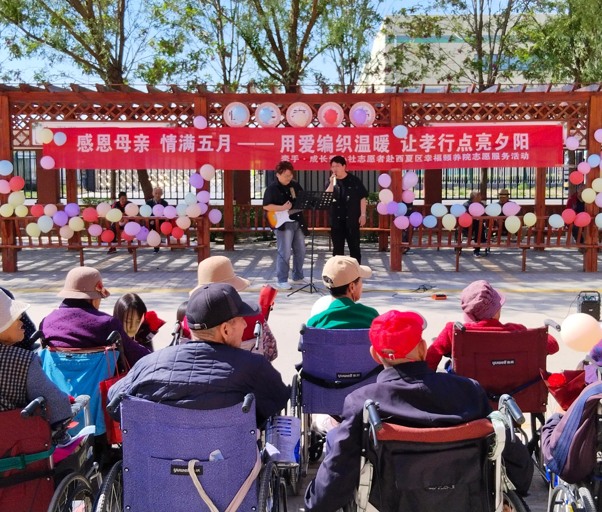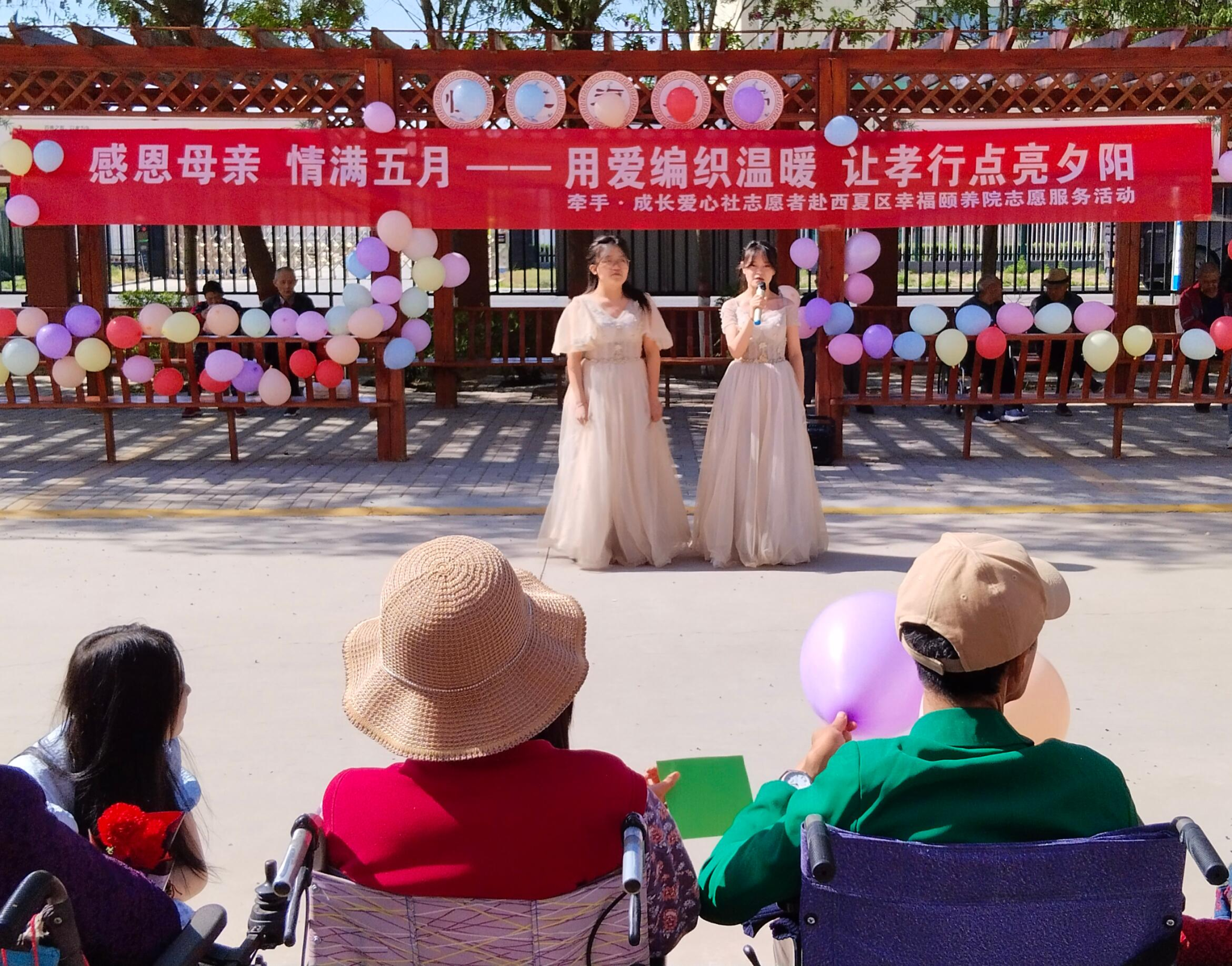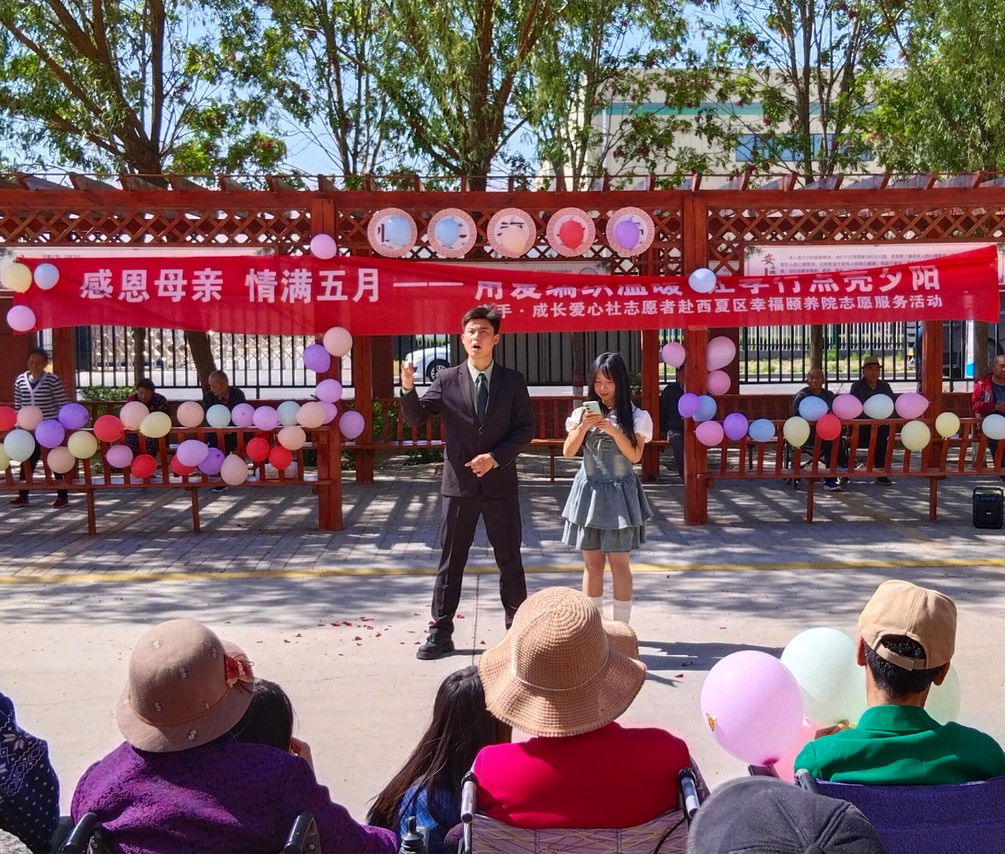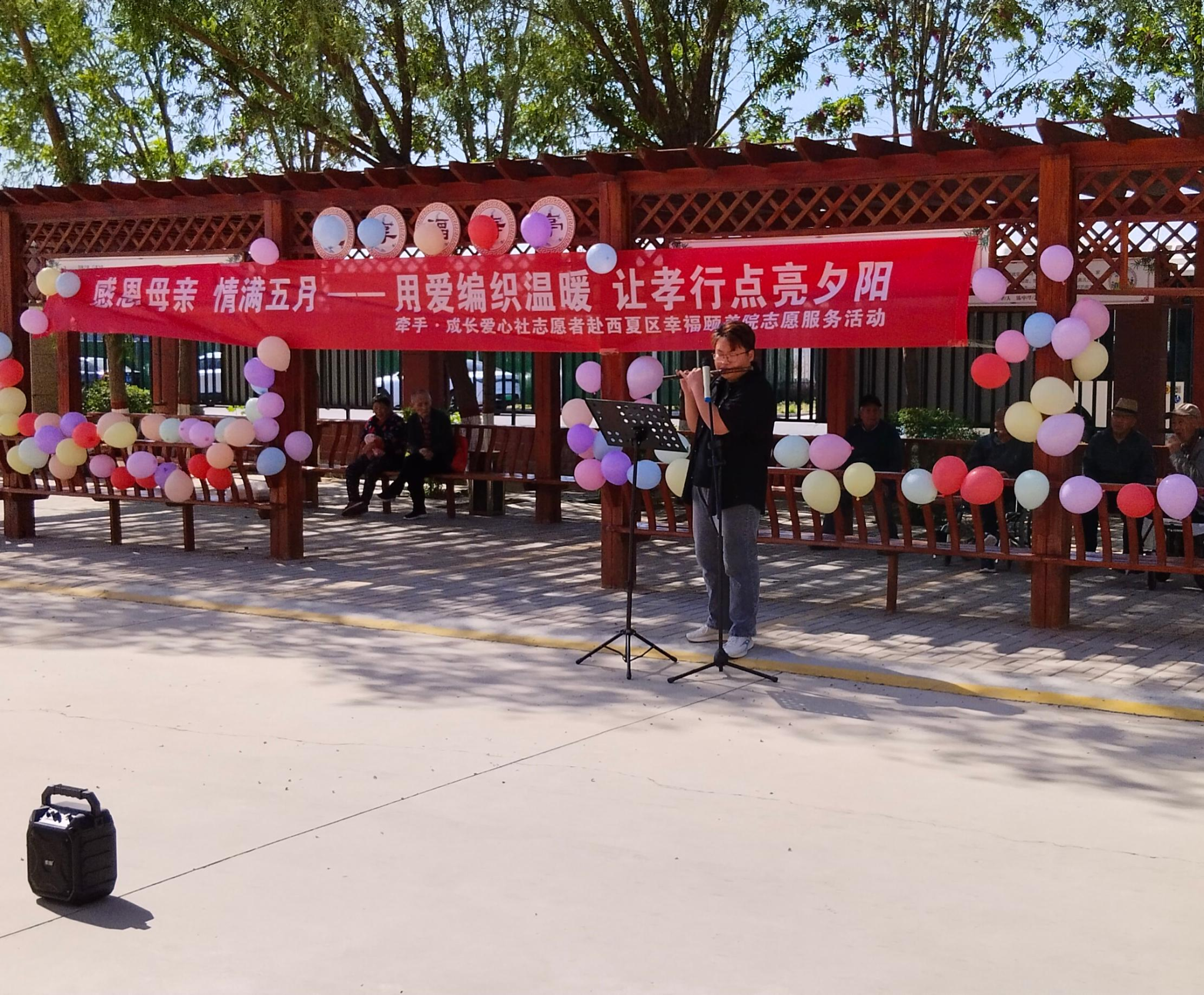 2025年5月11日,正值母亲节之际,牵手·成长爱心社联合老员工艺术团话剧部,组织40余名志愿者,赴西夏区幸福颐养院,以“感恩母亲,情满五月——用爱编织温暖,让孝行点亮夕阳”为主题,为院内老人献上了一场充满温情与活力的志愿服务活动。