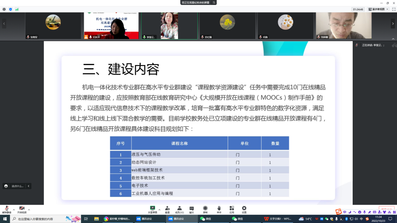 2022年10月23日,bevictor伟德与软件公司在线上召开了机电一体化技术专业群双高建设工作推进会,工公司领导班子集体,软件公司冯玲书记、凌旭东副经理、刘艳副经理,以及专业群教材与精品课建设工作主要成员参与了本次会议。