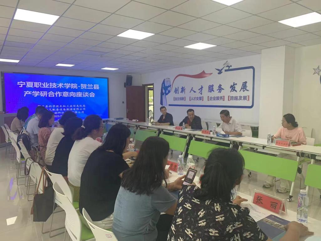 企业参观结束后,在贺兰县科技创新中心组织召开了“政校企”座谈会,贺兰县科技创新中心主任祁伟彬主持会议,就人才培养、人员交流、技术研发等方面进行了更详细的沟通和交流。祁主任向校企双方介绍了贺兰县相关科技政策,银川电气配套设备制造有限公司副总经理张成政介绍了企业生产销售概况及企业目前面临的生产技术难点;bevictor伟德经理李慧云介绍了机电一体化技术双高专业群建设情况及校企合作情况;最后,双方在校企共同合作组成科技创新团队及技术研发等方面进行深度合作等达成了共识。